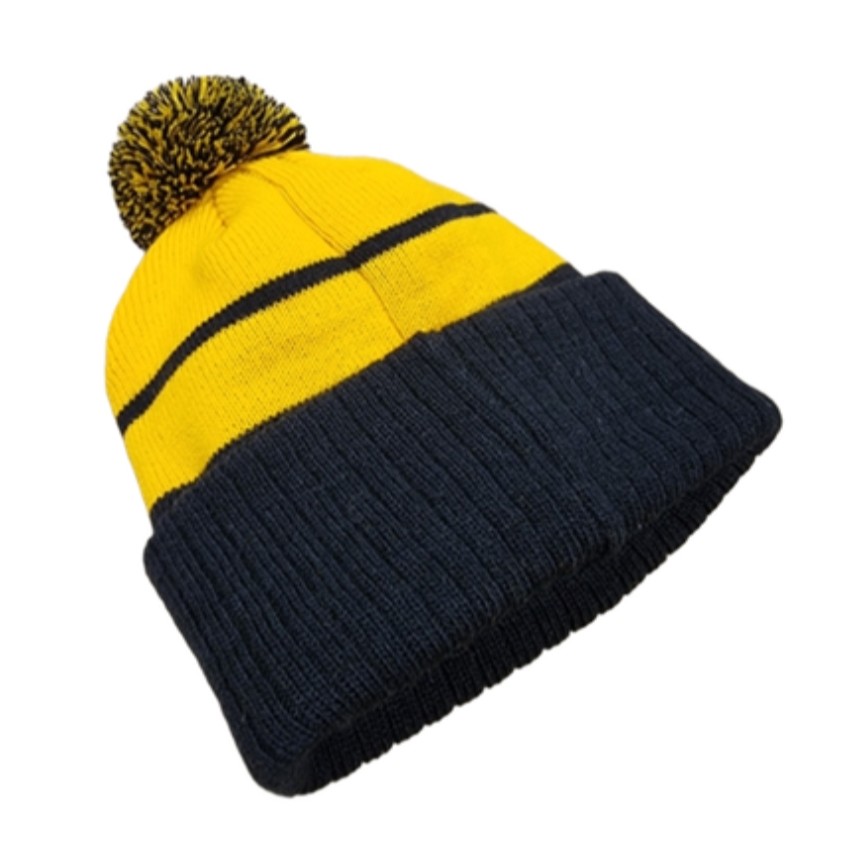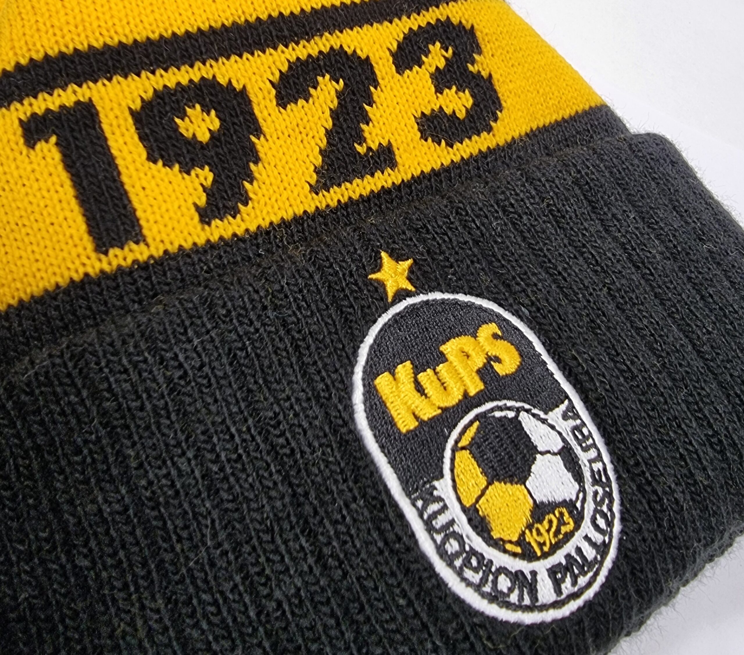 Klassikko. Muhkea ja lämmin tupsupipo keltamustalla värityksellä. Edessä KuPS-logo, sekä brodeerattuna seuran perustamisvuosi 1923.