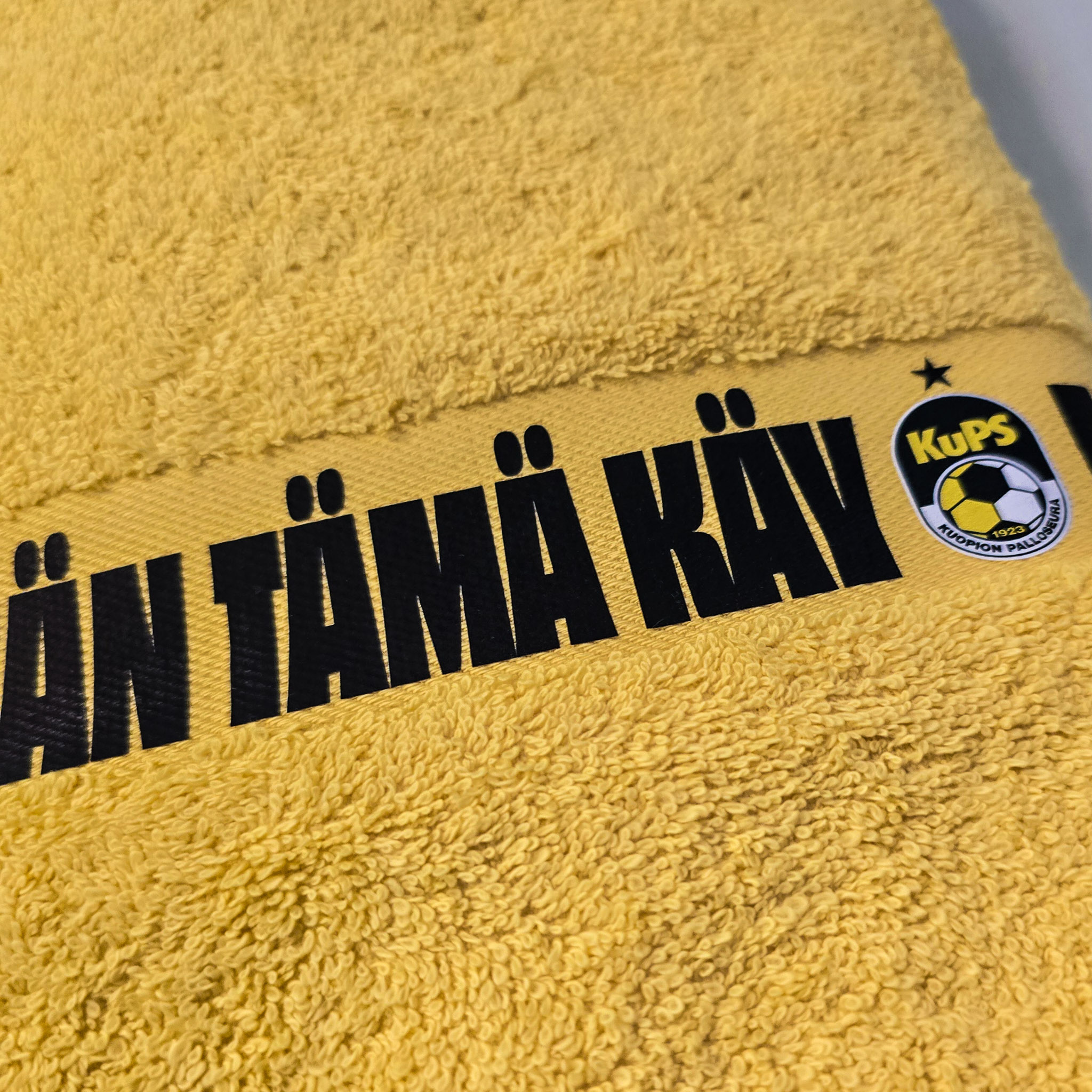 Upea keltainen KuPS Suomen mestaruuden kunniaksi tehty Meiltähän tämä käy -pyyhe.