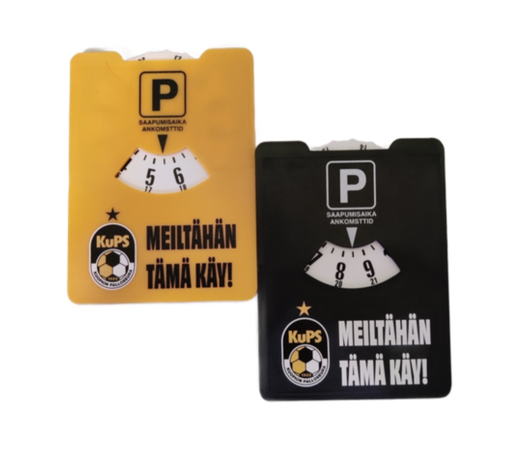KuPS Suomen mestaruuden kunniaksi tehty Meiltähän tämä käy-parkkikiekko. Väreinä keltainen ja musta.